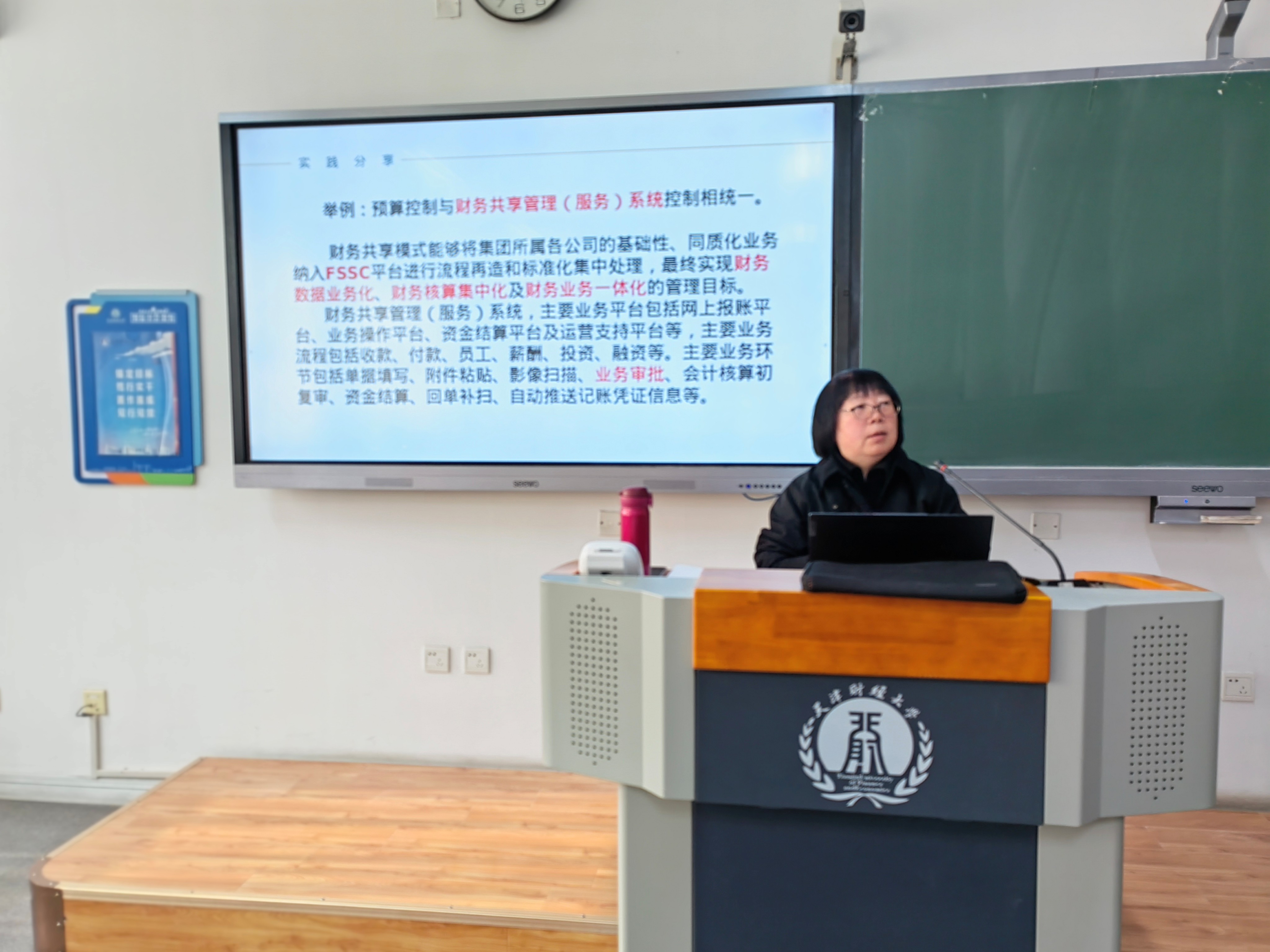 为深化会计学科产学研融合,助力学子夯实专业基础、提升实践应用能力,近日,天津财经大学会计学院成功举办“国有集团公司全面预算管理体系的实践与分享”实务讲座。本次讲座邀请到天津天保财务管理有限公司原副总经理、财务总监于若梅女士主讲,会计学院傅绍正副教授主持,学院各会计专业硕士及部分教师代表到场聆听学习。