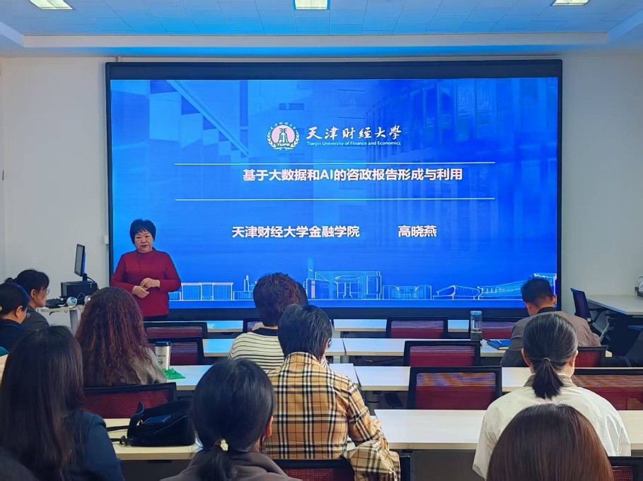 2026年4月17日,天津财经大学金融学院高晓燕教授来我院进行“基于大数据和AI的咨政报告形成与利用”的主题报告。会上,高晓燕教授从咨政成果项目落地、咨政报告撰写基本原则、咨政报告选题技巧、咨政报告实例与写作体会、AI赋能咨政报告等方面介绍了咨政报告的写作范式,并以自己的咨政成果为案例,层层解剖咨政报告撰写思路,为我院老师和同学们撰写咨政报告提供了经验分享和重要指导。