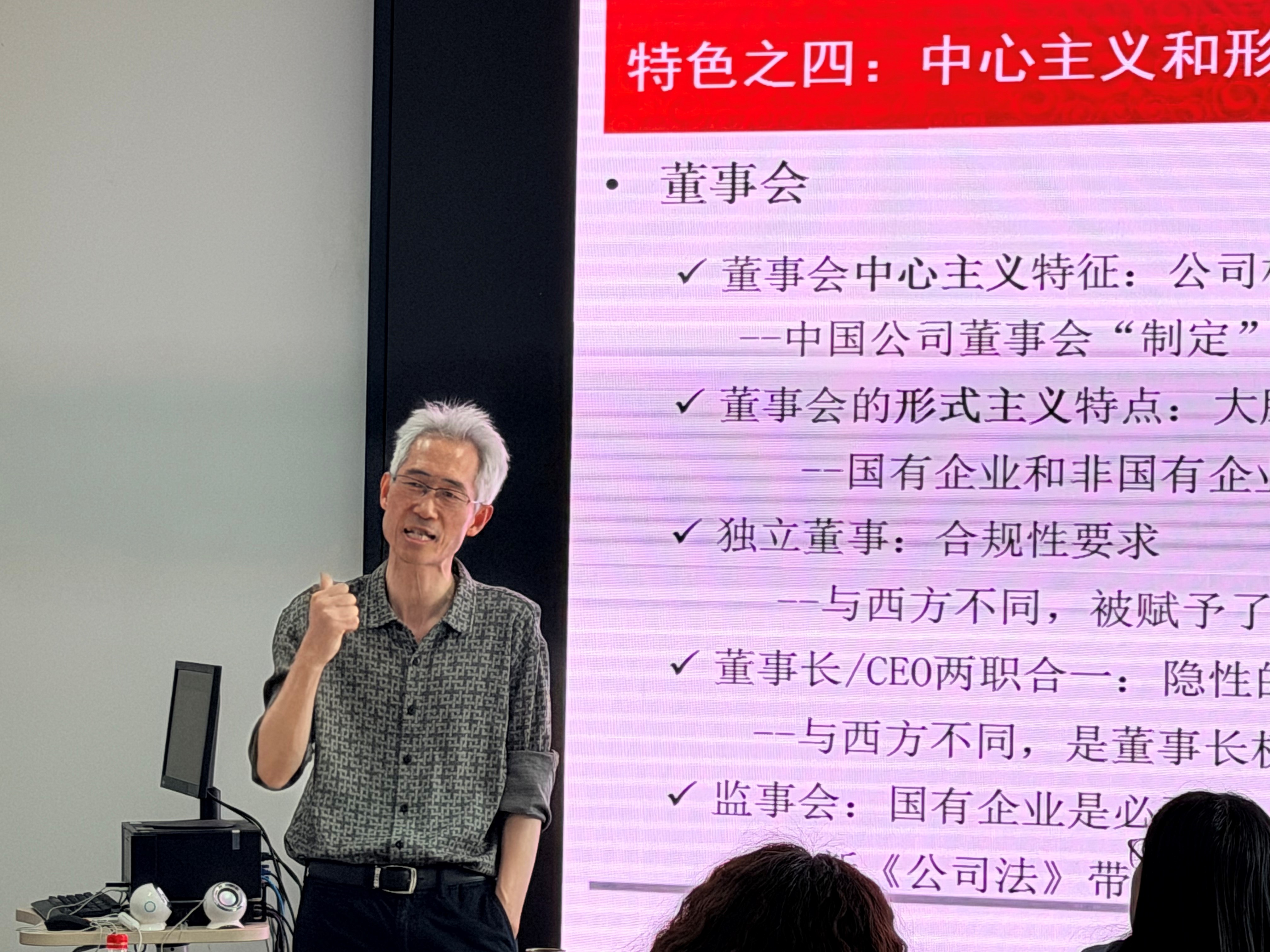 姜付秀教授从“为什么要强调公司治理的中国特色?”切入,系统阐述了中国公司治理的九大特色:两类企业和两类代理、集中的股权及相反的后果、作为交易者的机构投资者、兼具中心主义和形式主义的董事会、强监督下的弱经理激励、犯错成本较低的法律与监管、分割的经理人市场、活跃而友好的控制权市场、有效的产品市场竞争,为参会师生带来了一场深入浅出的学术报告。
